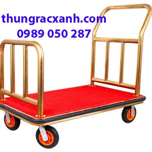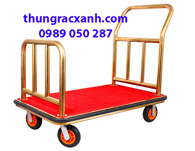 Đặc điểm xe đẩy hành lý khách sạn inox vàng.